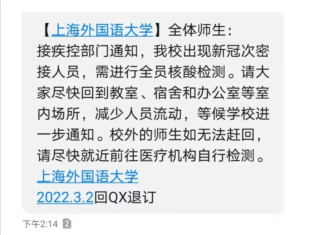 3月2日下午1点30分,2019级公共关系学专业本科生陈思宇在上课时收到了辅导员发布在年级群的紧急通知:当前课程结束后,全校停课进行核酸检测,请师生原地等待核酸检测安排,减少人员流动。