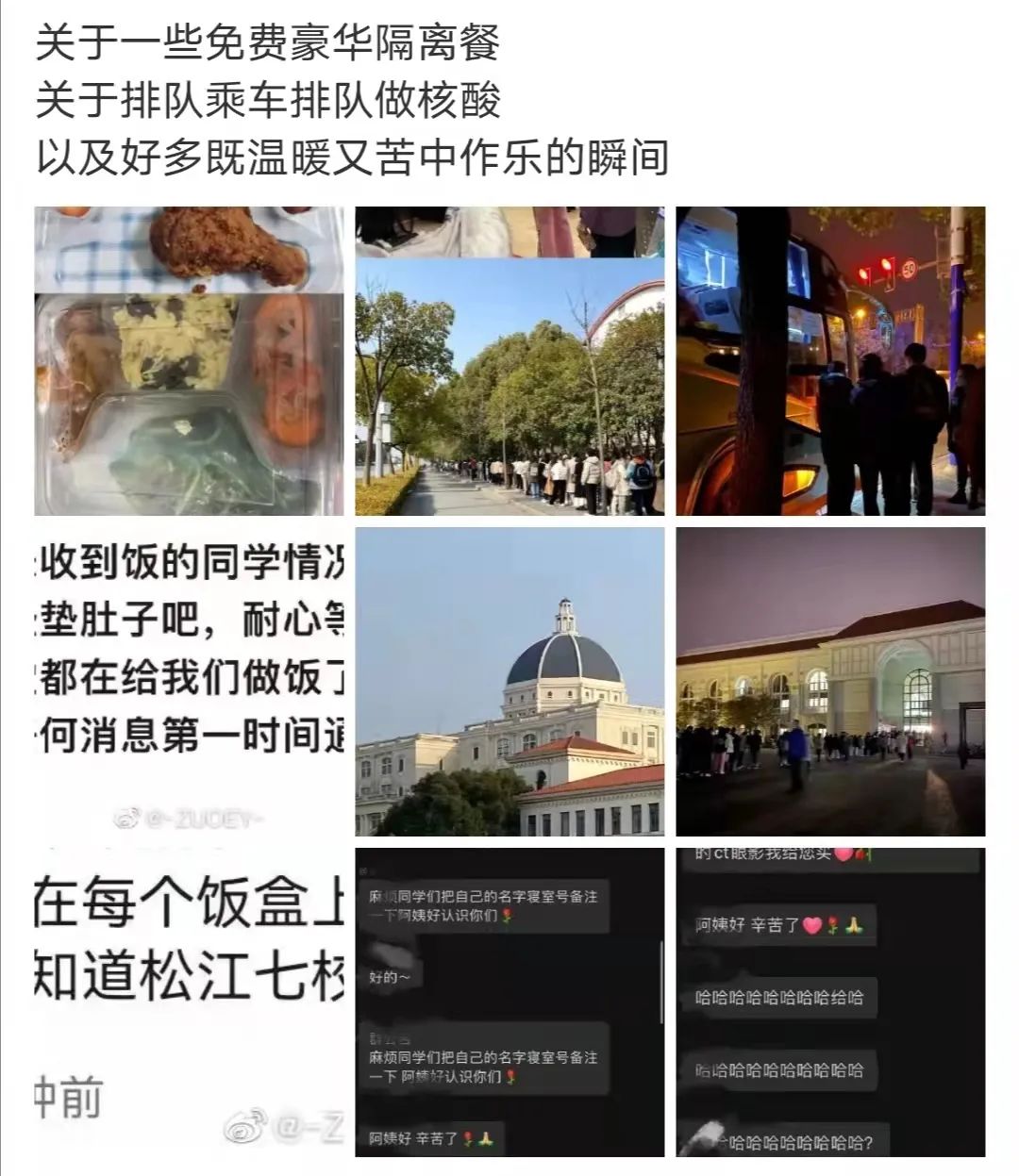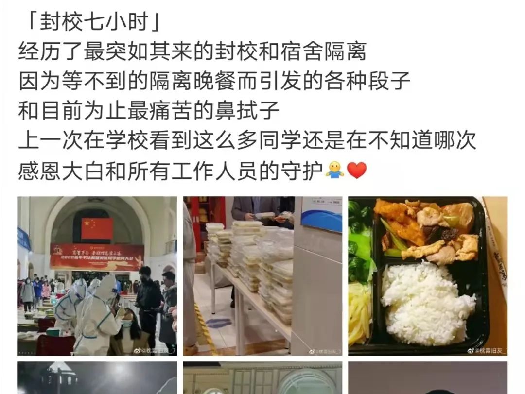 同学们说,“第一次如此近距离感受疫情防控的艰辛与不易,有过紧张,但是学校上下齐心协力、井井有条,我们感觉超级温暖。”为提供更人性化的校园服务,学校第一时间组织学生志愿者120余人,引导师生核酸检测,同时集合松江区多所兄弟高校的力量,为师生按楼宇送上免费爱心餐点、动态调整两校区班车运营时间.....