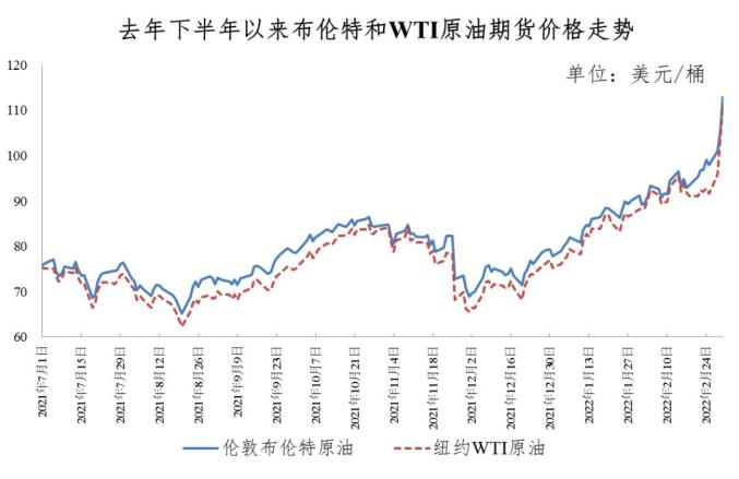 调价周期内,俄乌局势激化,推动油价持续大幅上涨。俄罗斯承认乌东地区独立,并采取特别军事行动,欧美随即宣布制裁措施,市场对原油供应下降的忧虑加重。欧佩克坚持“有限”扩产,美国原油库存下降,国际能源署计划释放的6000万桶原油储备规模不及全球一天消费量,更放大了市场对供应短缺的紧张情绪,油价因此持续冲高,3个交易日内两市油价连续跳涨并先后突破每桶100美元、110美元关口。平均来看,本轮调价周期伦敦布伦特、纽约WTI油价分别比上一调价周期上涨7.44%、4.78%。