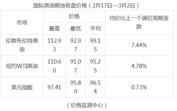 根据国家发改委消息,新一轮成品油调价窗口将于今天(3月3日)24时开启。据国家发改委价格监测中心监测,本轮成品油调价周期内(2月17日—3月2日)国际油价继续大幅上涨。平均来看,伦敦布伦特、纽约WTI油价比上轮调价周期上涨6.11%。受此影响,国内汽油、柴油零售价随之上调。