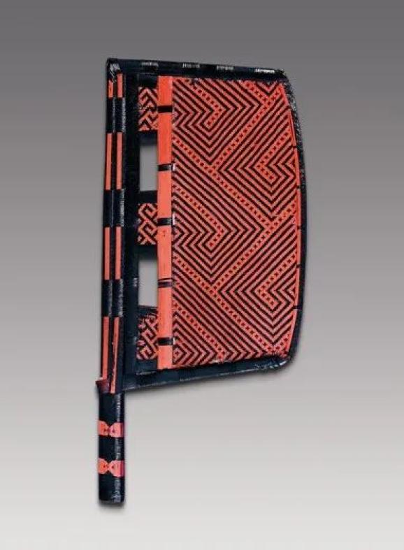 这种像菜刀一样的扇子是用极细薄的竹篾编成的,红黑两色构成矩形纹,柄的一侧有两个长方形孔,周边夹以较厚的竹片,纹饰十分规整,虽是2000多年前的遗物,却依旧光亮如新。