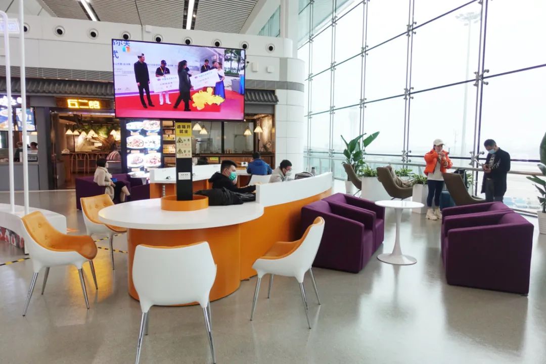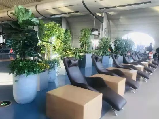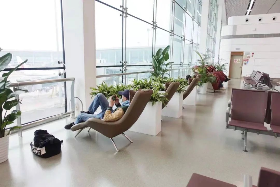 渝悦航旅·功能候机区观景设施,从旅客差异性需求出发,利用隔离区内航空观景视野优越区域,打造航空观景设施,提供600个满足观景、商务等需求的功能座位;采用自主设计景观与功能设施招商相结合的方式,打破传统布局,通过捕捉观景“制高点”,划分功能区域、差异化布局座椅,搭配植物景观等措施,在航站楼内建设了集航空观景、共享办公、休闲体验、亲子娱乐、便捷充电于一体的“渝悦航旅·功能候机区”,实现了“候机+观景”功能融合,“休憩+体验”服务提升。