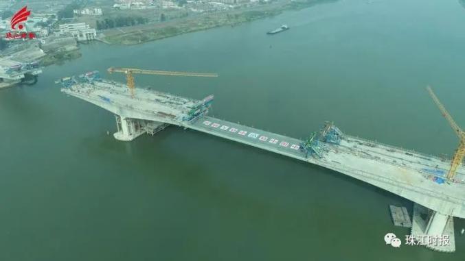 主航道主跨75米钢箱梁顺利提升就位。来源:珠江时报