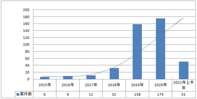 案件数量增长较快。2015-2021年上半年,适用赔礼道歉责任的环境民事公益诉讼案件数量呈快速增长趋势。(见图1)