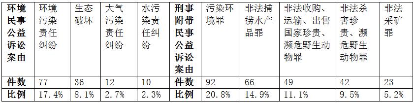 案由分布相对集中。民事案由集中在环境污染类纠纷;刑事案由主要为生态破坏类犯罪。(见表1)