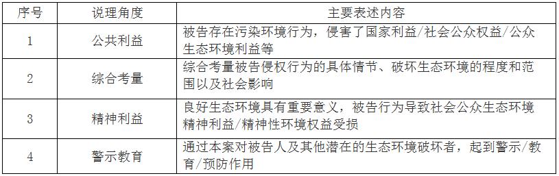 其次,明确赔礼道歉在三个层面的法律内涵:一是界定责任性质。赔礼道歉责任是一种必须由本人实施的行为给付责任,具体到环境侵权领域,可要求侵权人通过口头、书面或其它形式向社会公众表示歉意,并同步作出环境保护承诺。二是阐明针对的受损法益。裁判说理中应阐明环境侵权行为损害公众精神性环境权益,对于公众该受损法益,侵权人应进行赔礼道歉,判决主文中亦应对此予以明确。三是全面评价赔礼道歉的多重法律作用。即对被告使其因环境侵权行为在名誉上受到法律惩罚,同时又可修复受损社会关系;对公众可救济其在精神层面不可量化的利益损害,并震慑潜在侵权人实现环境保护一般预防。