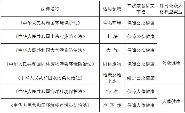 作为一种人格恢复性责任方式,应当明确赔礼道歉责任在环境民事公益诉讼中针对的公众人格权益类型。对此,可从环境保护相关立法宗旨中进行探究。(见表6)