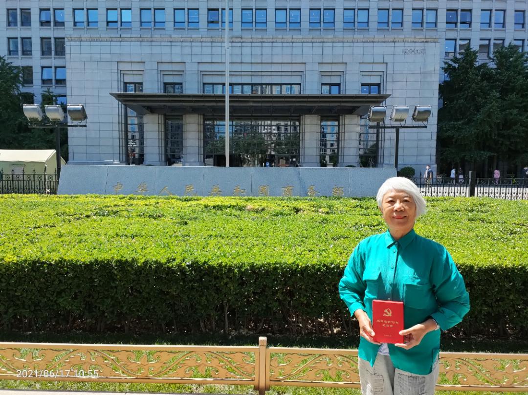 2021年6月17日,蔡玲荣获光荣在党50年纪念章在商务部办公楼前留影(蔡玲 供图)