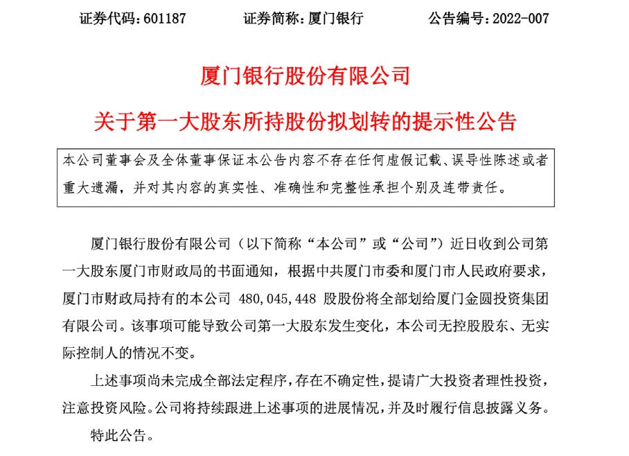 3月3日晚间,厦门银行发布公告称,近日收到公司第一大股东厦门市财政局的书面通知,根据中共厦门市委和厦门市人民政府要求,厦门市财政局持有的本公司4.8亿股股份将全部划给厦门金圆投资集团有限公司。