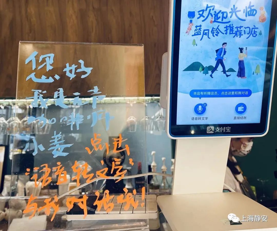 “小日子”咖啡店在收银台前摆放着一个“特别”的机器:它除了收银码之外,多了一个功能——“语言转文字”。旁边立有一块标示牌:“您好,我是无声咖啡师,点击语言转文字,开启与我的对话哦!”