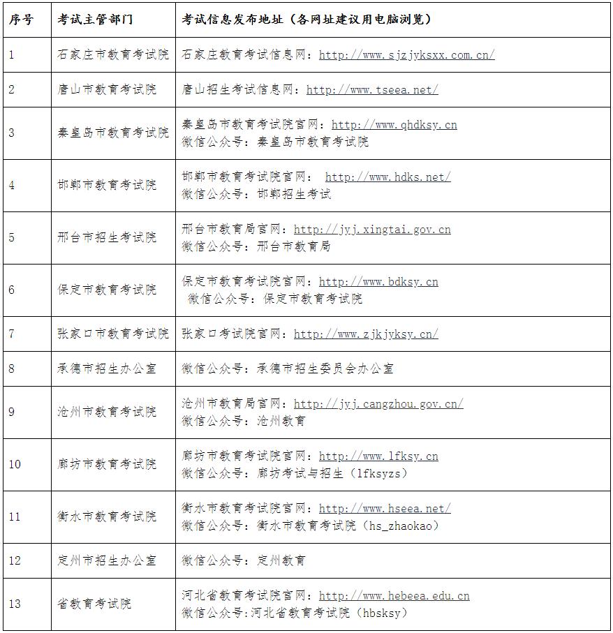 五、与考试有关的信息、通知和要求,我院将第一时间在河北省教育考试院官网(httpwww.hebeea.edu.cn)、河北省教育考试院官方微信公众号(hbsksy)发布;各考区属地疫情防控要求等信息、通知,由各市第一时间发布,发布地址见文末附件。以上信息请考生务必密切关注(尤其是考前两天)。