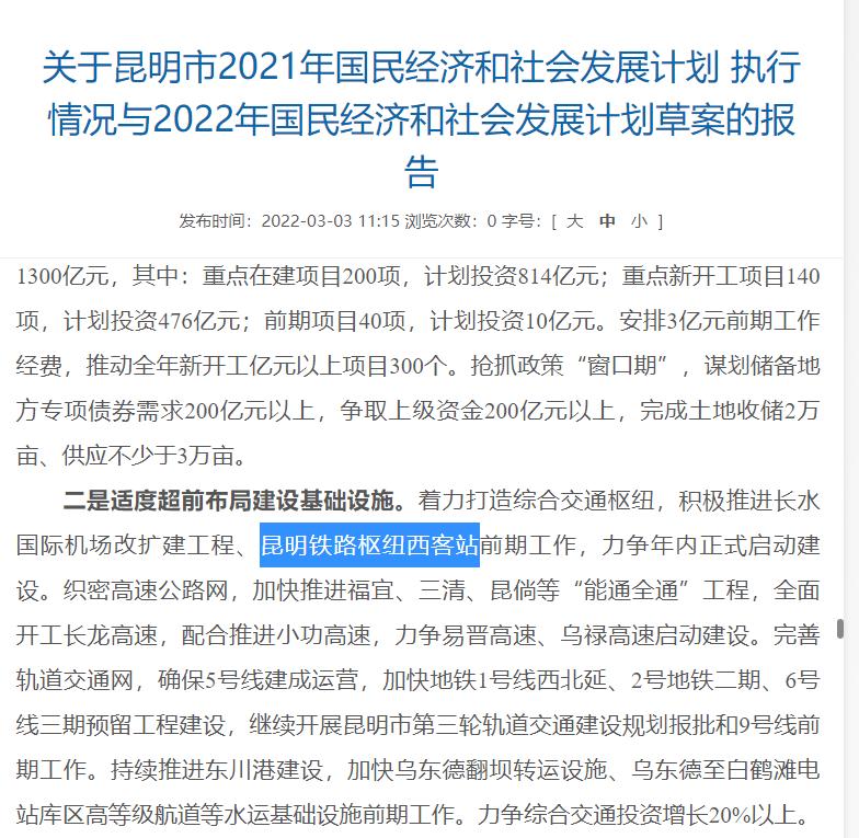 “目前昆明铁路枢纽西客站项目正在加紧推进中,计划2025年完成项目建设。”2021年4月,昆明市交运局负责人向媒体介绍了昆明铁路枢纽西客站项目的最新进展。