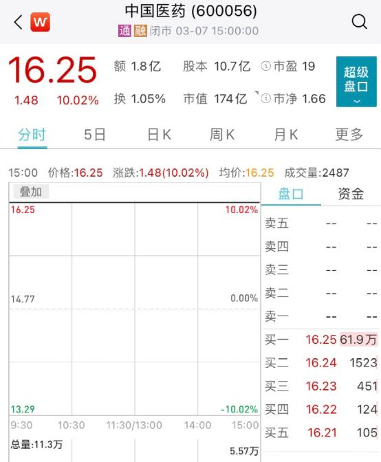 虽然中国医药早已发过风险提示公告,但依然难挡资金热情。3月7日,中国医药开盘涨停,61.9万手封板,实现四连板。截至收盘,该股报16.25元,总市值为174亿元。