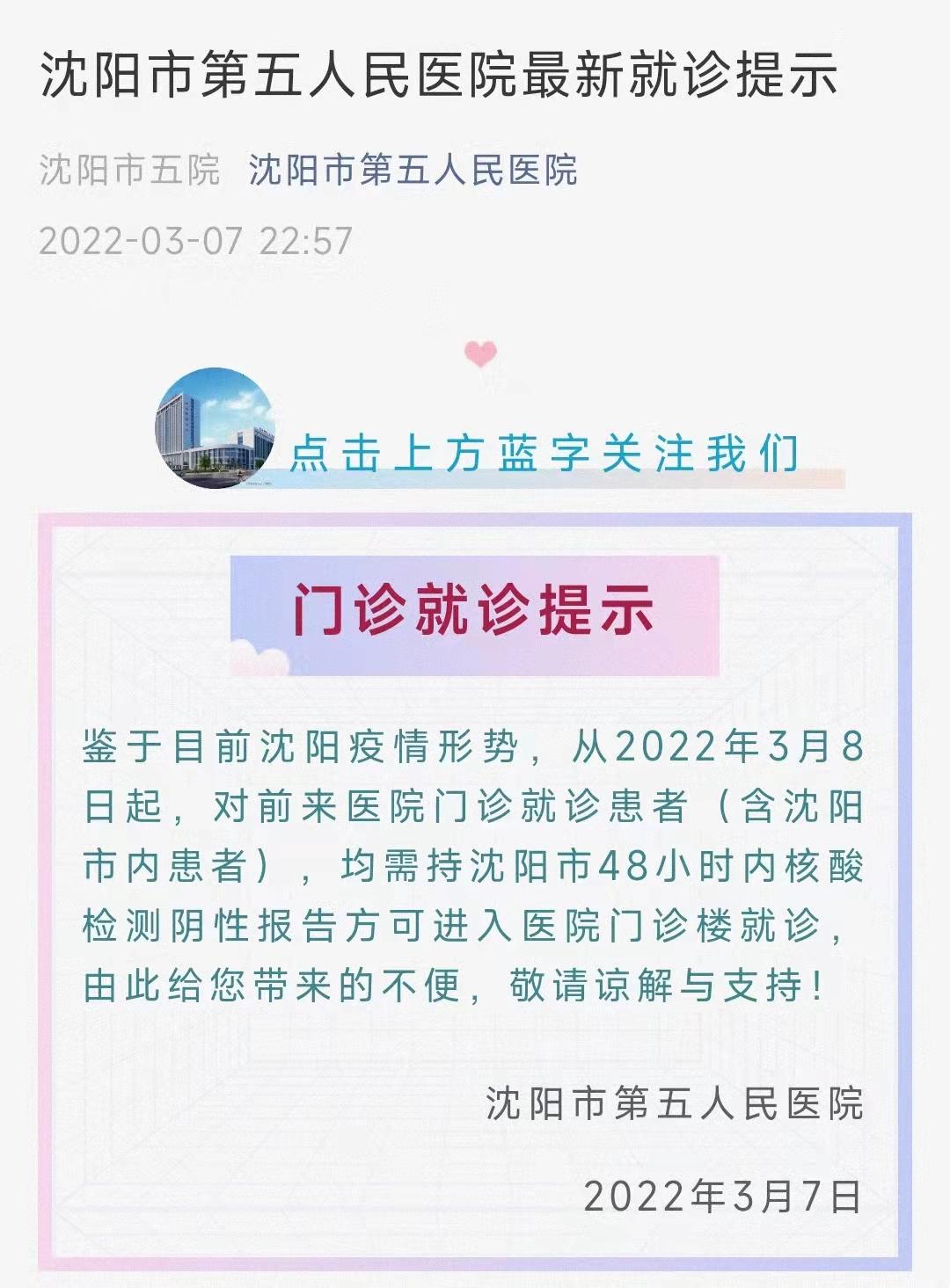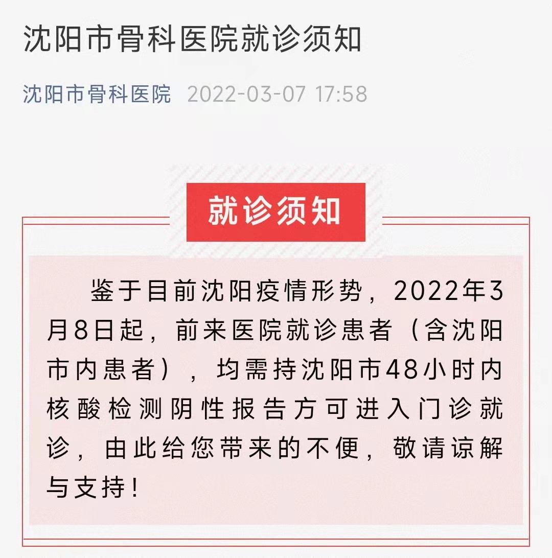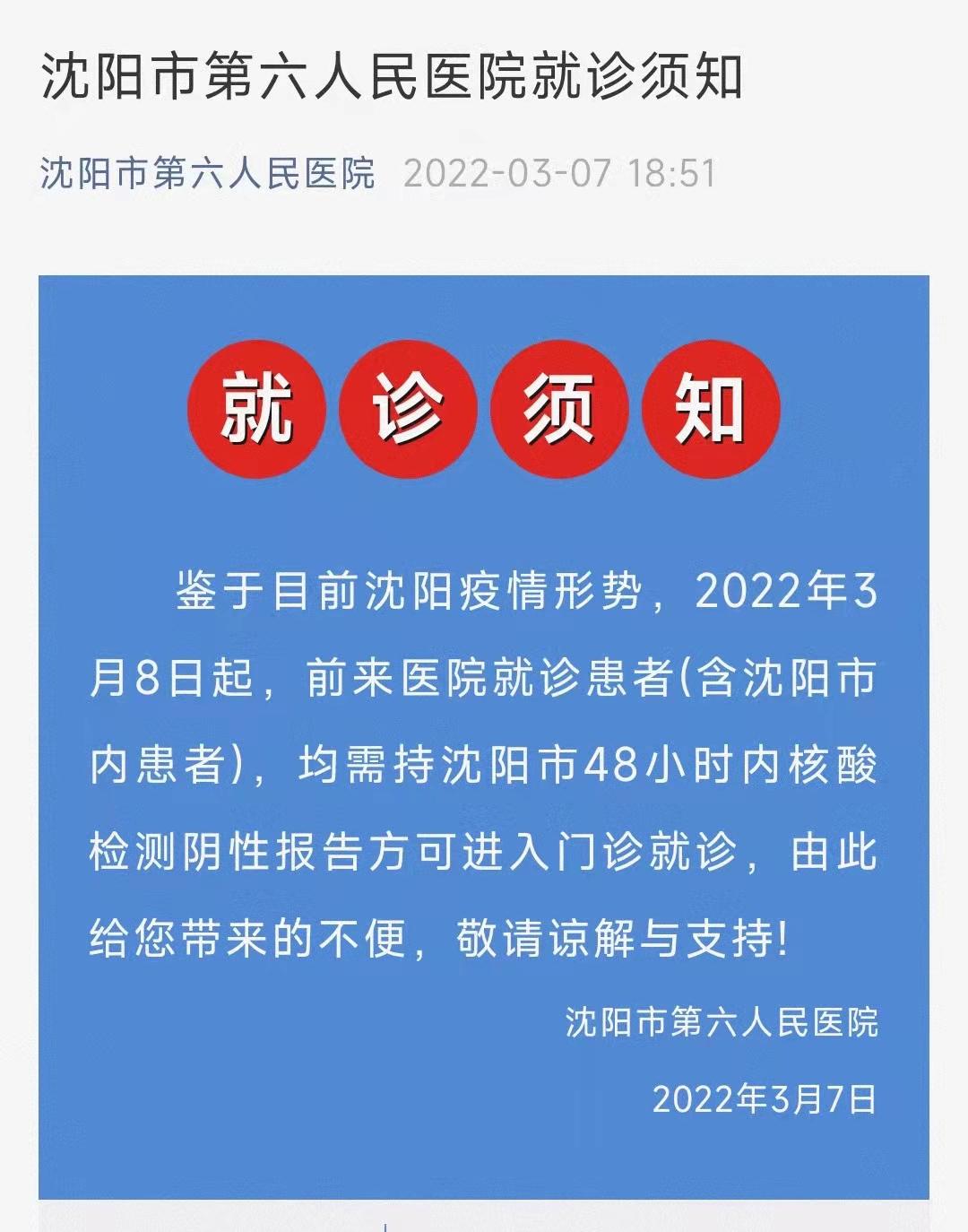鉴于目前沈阳疫情形势,沈阳多家医院已经发布通知,从3月8日起,前来医院就诊患者(含沈阳市内患者),均需持沈阳市48小时内核酸检测阴性报告方可进入门诊就诊。
