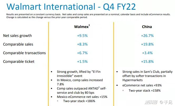 根据沃尔玛中国官微的消息,第四季度中国区净销售额增长26.7%,可比销售额增长19.8%,其中山姆会员商店表现出色,截止2021年第四季度,中国区山姆会员店的付费会员超过了400万,这也使得沃尔玛中国区的销售额不降反升,同时山姆会员店收入736亿美元,同比+5.1%。会员收入同比增长11.3%。