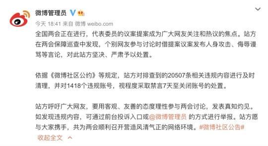 7日,@微博管理员 发布消息称,站方在两会保障巡查中发现,个别网友参与讨论时借提案议案发布人身攻击、侮辱谩骂等言论,对此站方坚决、严肃予以处置。