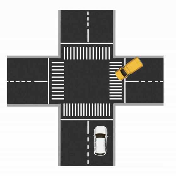 这个“让右原则”就跟刚才的情况不一样了,这条原则体现在没有红绿灯和让行标志的路口,两辆车交叉方向直行或左转,这种情况下就要执行“让右原则”。如果两辆车发生事故,左侧的车要承担全部责任。