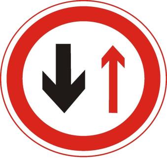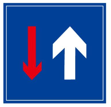 前方路段车辆在会车时享有优先通行权利。标志颜色为蓝底,对向来车为红色箭头,行进方向为白色箭头。