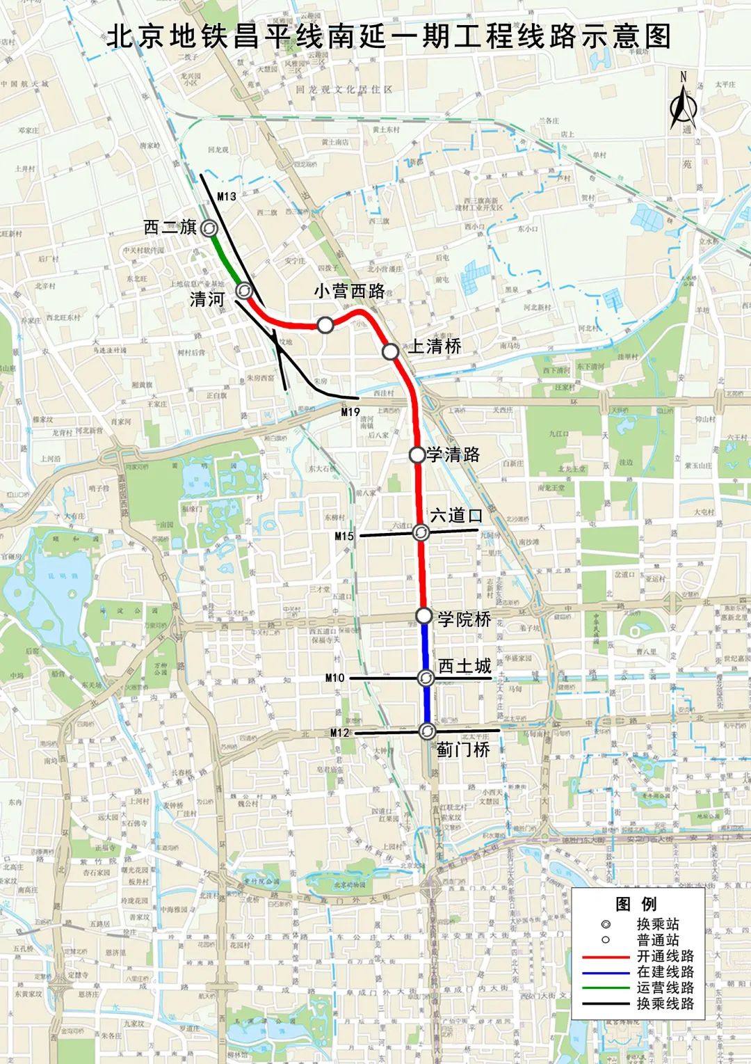 线路北起清河站、南至学院桥站,全长8.2公里,全部位于海淀区,均为地下线,设站5座,建成开通后可与京张高铁、13号线、15号线实现换乘,进一步扩大昌平线服务范围,加密中心城区线网,方便上地、学院区、北太平庄等沿线商务、科研教育和居住区居民出行。