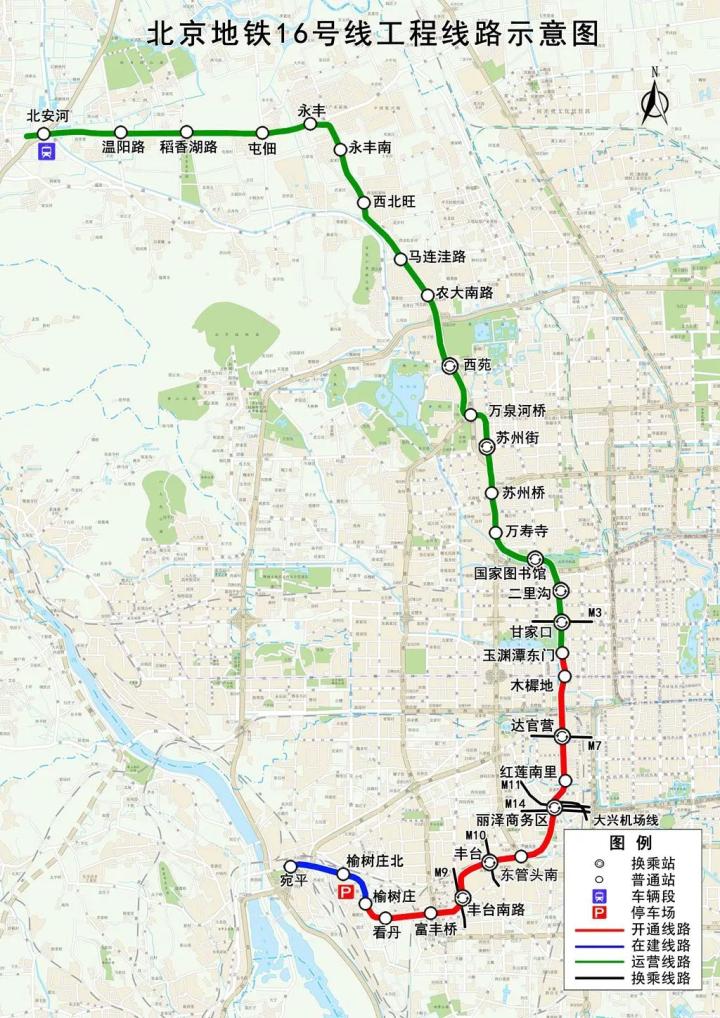 16号线(玉渊潭东门-榆树庄),线路北起玉渊潭东门站、南至榆树庄站,全长14.2公里,设站10座。