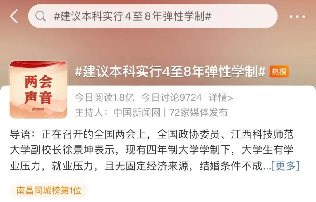 3月8日,话题#建议本科实行4至8年弹性学制#,引发热议。