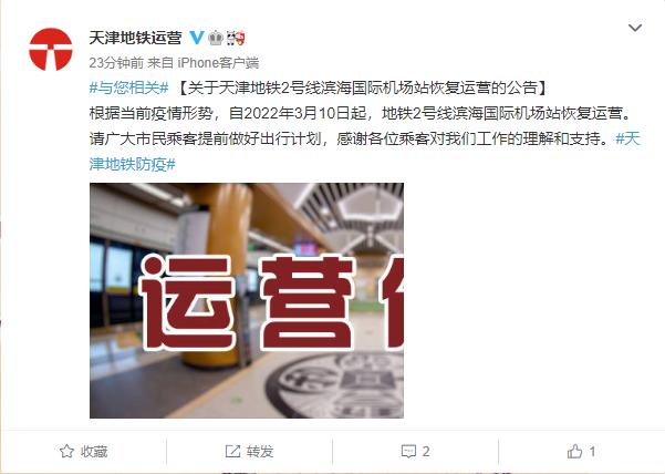 关于天津地铁2号线滨海国际机场站恢复运营的公告