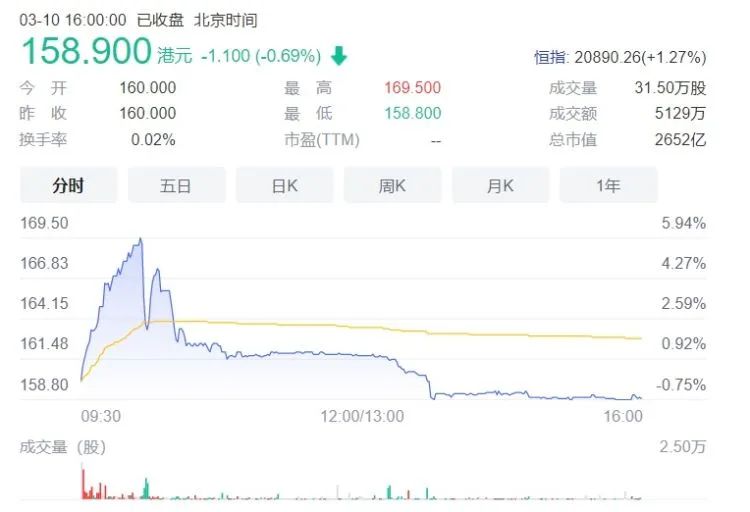 蔚来首日开盘价为160港元,盘中一度上涨近6%,收盘价为158.9港元,跌幅0.688%,成交量31.5万股,总市值2652亿港元。