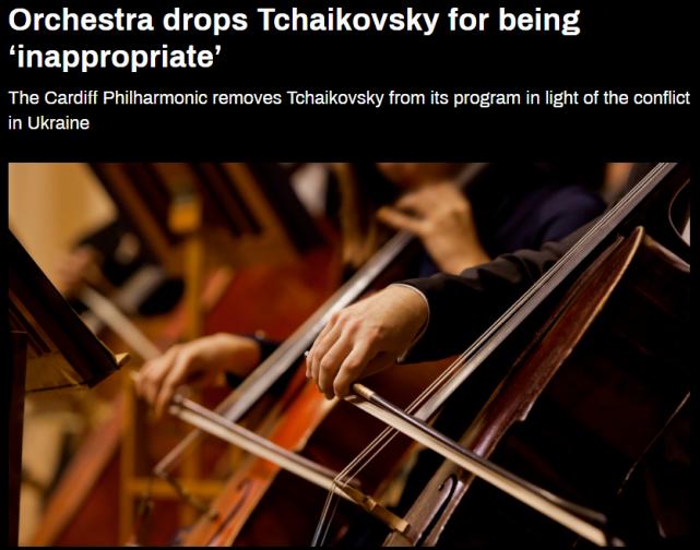 据今日俄罗斯电视台(RT)10日报道,英国威尔士卡迪夫爱乐乐团原本即将举行一场柴可夫斯基作品的音乐会,但主办方认为存在问题,如今演奏的曲目已被重新设计,删除了这位著名俄罗斯作曲家的所有作品。