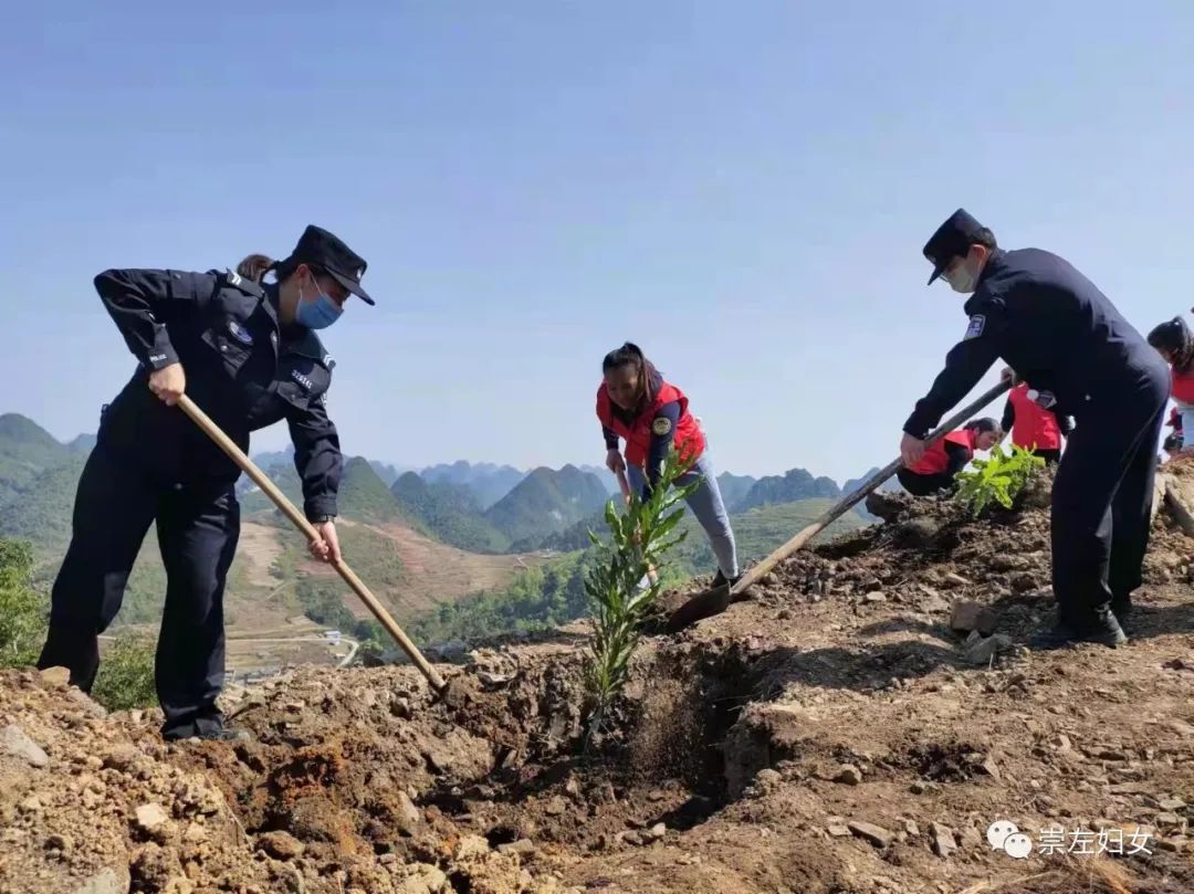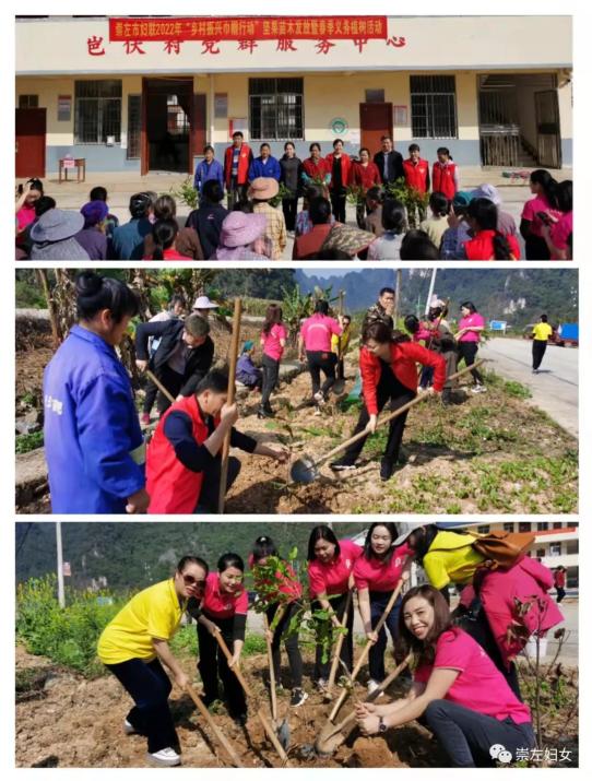 崇左市妇联携崇左市女企业家协会会员、巾帼志愿者到大新县那岭乡岜伏村开展“乡村振兴巾帼行动”坚果苗木发放暨春季义务植树活动。为妇女群众送去坚果苗木一批,组织林业专家现场为妇女群众培训坚果种植技术,并为旧厅屯种下近100棵的坚果苗。