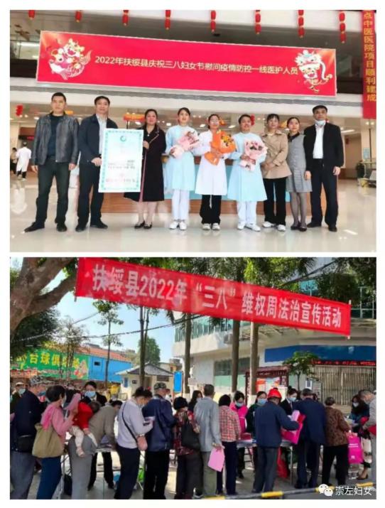 扶绥县妇联到各单位及各医疗机构慰问部分女干部及防疫一线的医护人员、爱心女企业家146人;组织10个县直部门开展“三八”维权法治宣传活动,宣传《家庭教育促进法》、《反家庭暴力法》、《妇女维权200问》及《防范化解婚姻家庭矛盾纠纷》等共发放宣传材料5000余份。