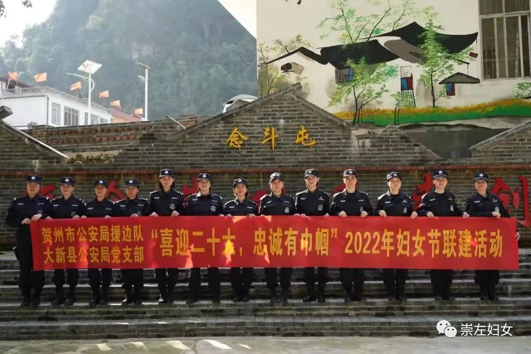 大新县与驻守在该县硕龙镇的贺州市公安局援边队女警们开展“喜迎二十大 忠诚有巾帼”暨庆祝2022年妇女节联建活动,展示了女警学干结合、胸怀柔情、肩负担当的精神风貌。