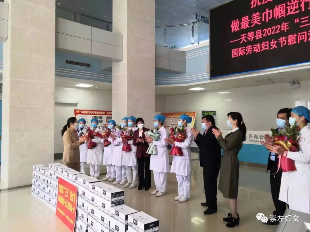 天等县开展以“抗疫有我 做最美巾帼逆行者”为主题慰问活动,慰问县人民医院、县中医院、县妇幼保健院等防疫一线女性医务人员;“围绕五大振兴 贡献巾帼力量”为主题的女领导干部座谈会,号召女性干部立足岗位、守岗尽责,在各自岗位上贡献巾帼力量,以实际行动迎接党的二十大胜利召开。