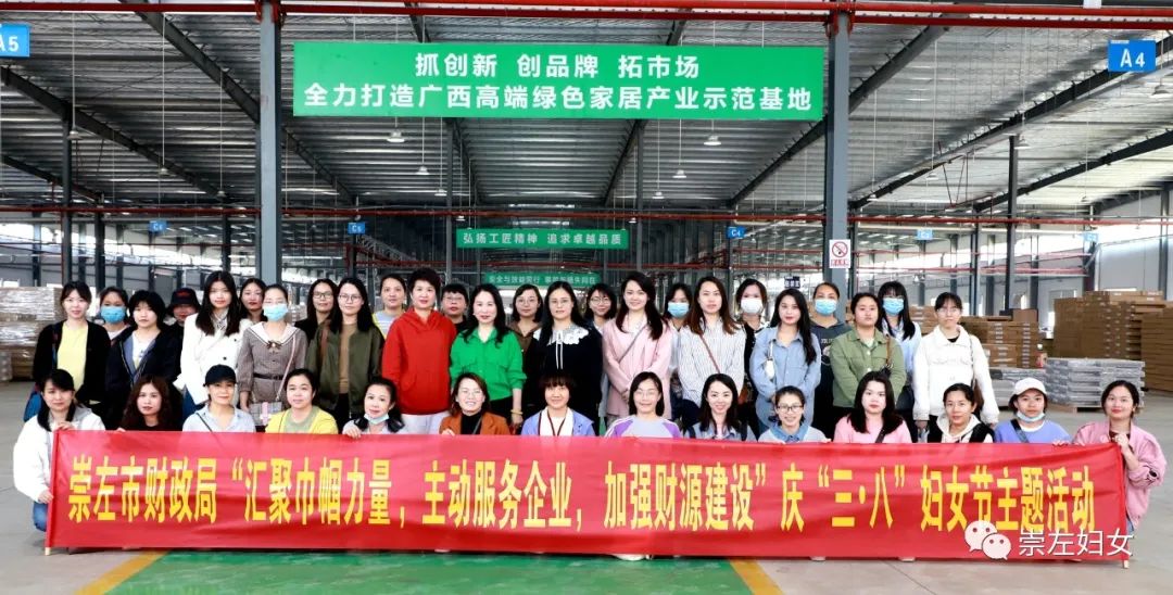 崇左市财政局组织全局女职工到中泰产业园开展财源建设调研暨庆“三八”妇女节主题活动,在广西崇左欧卡罗家居有限公司、广西乐林林业开发有限公司现场了解企业项目的基本情况、推进运营过程中存在的问题,与一线工作人员交流互动,共庆“三八”国际妇女节。