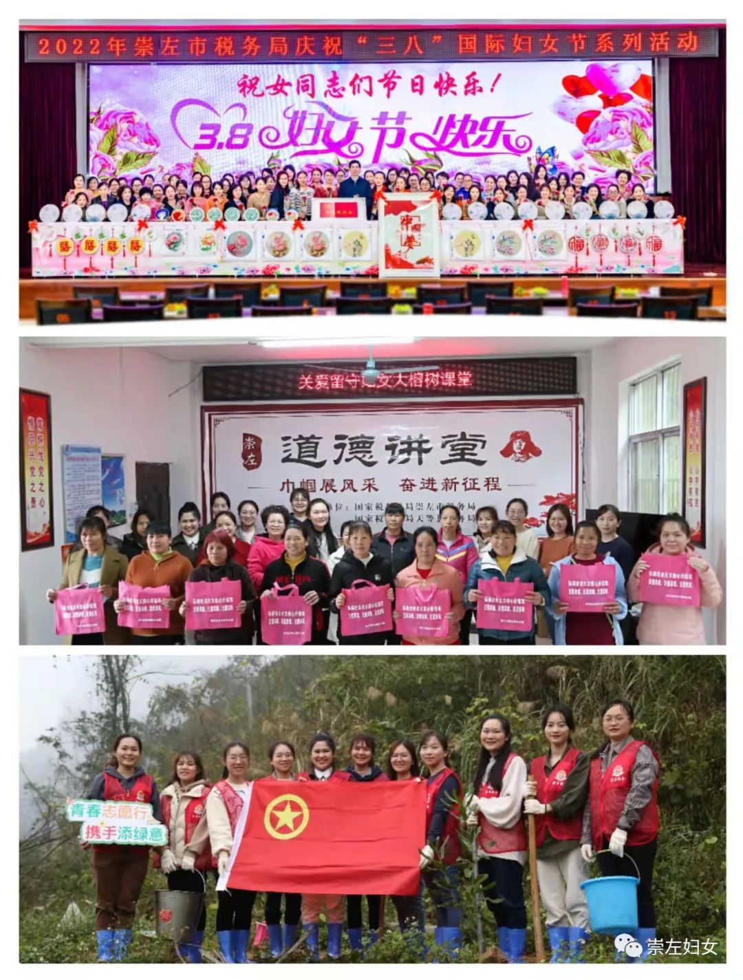 崇左市税务局组织全体女干部职工举办“感党恩 颂祖国 手绣寄深情”作品展示活动;到定点帮扶村——天等县福宁村举办“巾帼展风采 奋进新征程”道德讲堂和“学雷锋义务植树”志愿服务活动。