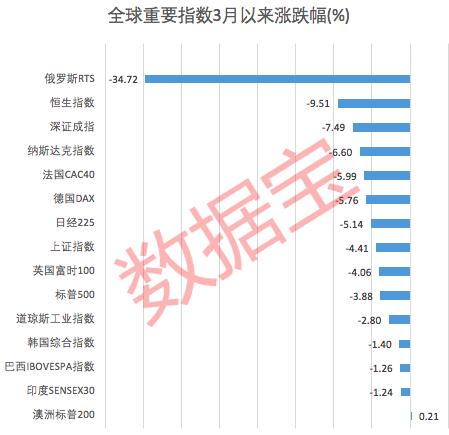 3月以来,除澳洲标普200指数外,美国、印度、巴西、英国、欧洲、中国等国家(地区)14只重要指数全部下跌,其中俄罗斯RTS指数跌幅接近35%,恒生指数、纳斯达克指数、德国DAX指数跌幅均超过5%。据不完全统计,美股、英国股市、中国香港、A股市值四大重要全球股市资产蒸发超过30万亿人民币,其中美股流失额近20万亿元。