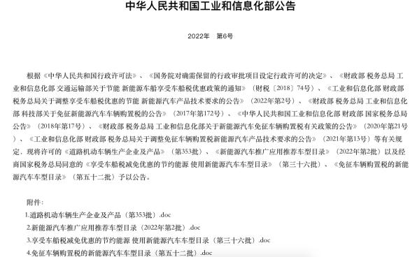 经过一个多月等待,工信部终于发布《新能源汽车推广应用推荐车型目录》(2022年第2批)以及经商国家税务总局同意的《享受车船税减免优惠的节约能源 使用新能源汽车车型目录》(第三十六批)、《免征车辆购置税的新能源汽车车型目录》(第五十二批)。