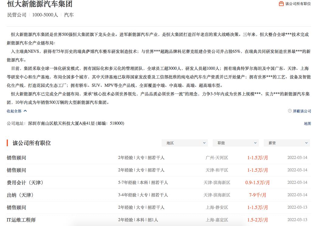 同时,恒驰汽车在今年初启动了招聘,从恒驰汽车发布的招聘海报来看,该公司高薪聘请汽车销售顾问,工作地点包括北京、上海、广州、天津、深圳、郑州等15个城市,目前相关招聘平台上依旧能够看到恒大汽车的招聘信息。