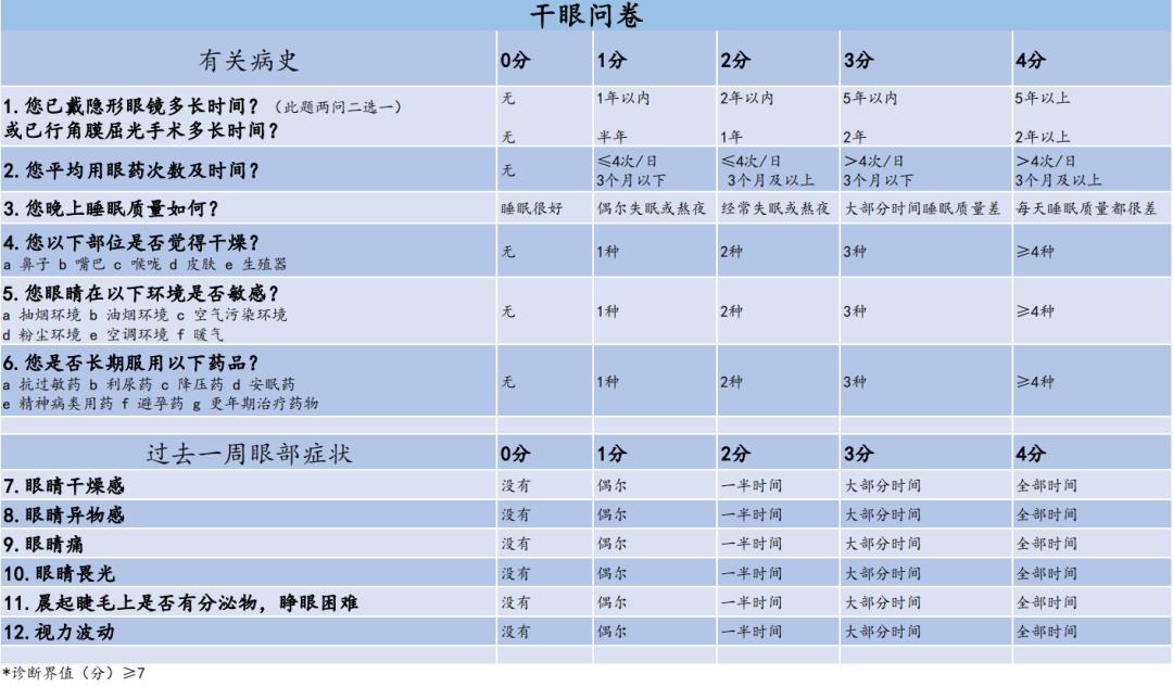 另外,觉得眼睛干不一定就是干眼。平时如果觉得眼睛有干涩、不适的感觉,可以先通过干眼问卷量表(见下表),初步判断自己的干眼情况。如果比较严重则需要去医院通过泪河宽度、泪膜破裂时间以及泪液分泌实验Ⅰ等检查来进一步明确自己的泪液情况。