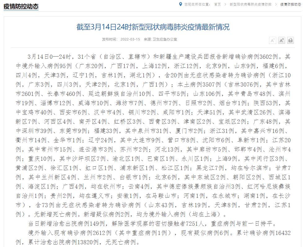 3月14日0—24时,31个省(自治区、直辖市)和新疆生产建设兵团报告新增确诊病例3602例。其中境外输入病例95例(广东20例,广西17例,上海12例,浙江12例,北京9例,山东9例,福建6例,四川4例,天津3例,辽宁1例,吉林1例,湖北1例),含20例由无症状感染者转为确诊病例(浙江10例,广东3例,四川3例,天津2例,北京1例,广西1例);本土病例3507例(吉林3076例,其中吉林市2601例、长春市460例、延边朝鲜族自治州10例、四平市5例;山东106例,其中青岛市48例、滨州市19例、淄博市12例、威海市10例、潍坊市7例、德州市7例、日照市2例、烟台市1例;陕西53例,其中宝鸡市40例、西安市6例、汉中市4例、铜川市2例、咸阳市1例;天津51例,其中武清区26例、滨海新区7例、河西区4例、南开区4例、红桥区3例、西青区3例、津南区2例、宝坻区2例;广东48例,其中深圳市39例、东莞市9例;福建33例,其中泉州市31例、厦门市2例;浙江31例,其中嘉兴市16例、衢州市14例、金华市1例;辽宁24例,其中大连市9例、营口市8例、沈阳市6例、阜新市1例;江苏20例,其中常州市15例、连云港市3例、苏州市2例;河北13例,其中廊坊市5例、邯郸市4例、沧州市4例;重庆10例,其中沙坪坝区7例、渝北区1例、巴南区1例、永川区1例;上海9例,其中闵行区3例、黄浦区2例、徐汇区1例、虹口区1例、浦东新区1例、松江区1例;黑龙江7例,均在哈尔滨市;甘肃7例,其中兰州新区4例、兰州市2例、白银市1例;北京6例,其中东城区2例、朝阳区2例、西城区1例、海淀区1例;广西4例,均在钦州市;云南4例,其中德宏傣族景颇族自治州3例、红河哈尼族彝族自治州1例;贵州2例,均在遵义市;安徽1例,在马鞍山市;河南1例,在永城市;湖南1例,在长沙市),含73例由无症状感染者转为确诊病例(山东43例,吉林19例,天津8例,甘肃2例,江苏1例)。无新增死亡病例。新增疑似病例2例,均为境外输入病例(均在上海)。