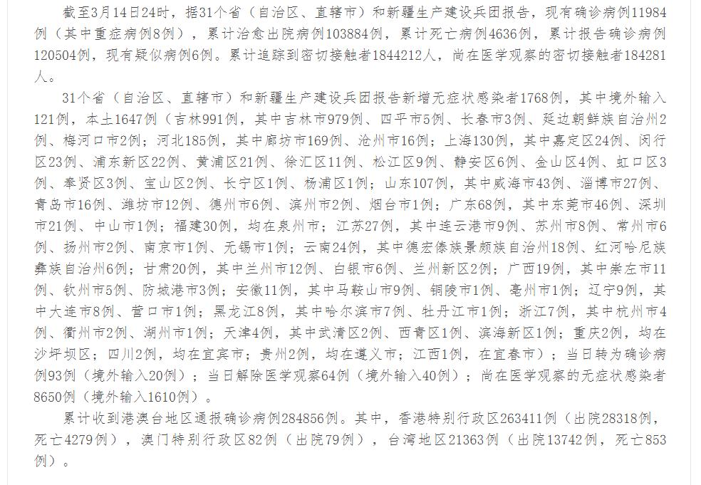 截至3月14日24时,据31个省(自治区、直辖市)和新疆生产建设兵团报告,现有确诊病例11984例(其中重症病例8例),累计治愈出院病例103884例,累计死亡病例4636例,累计报告确诊病例120504例,现有疑似病例6例。累计追踪到密切接触者1844212人,尚在医学观察的密切接触者184281人。