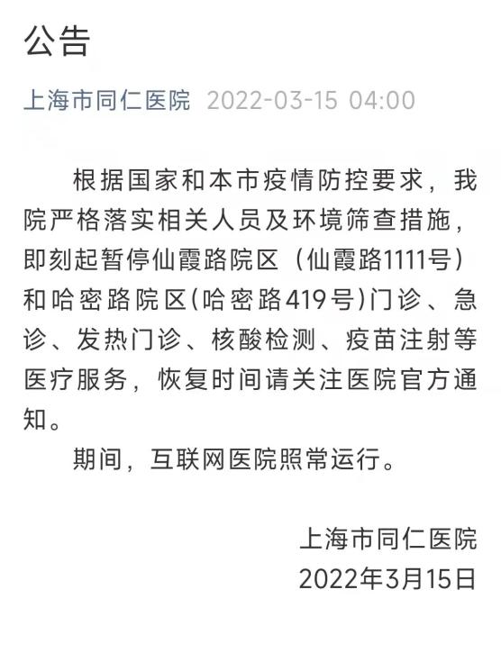 今天(15日)凌晨,上海市同仁医院发布公告:暂停仙霞路院区、哈密路院区门急诊等医疗服务。