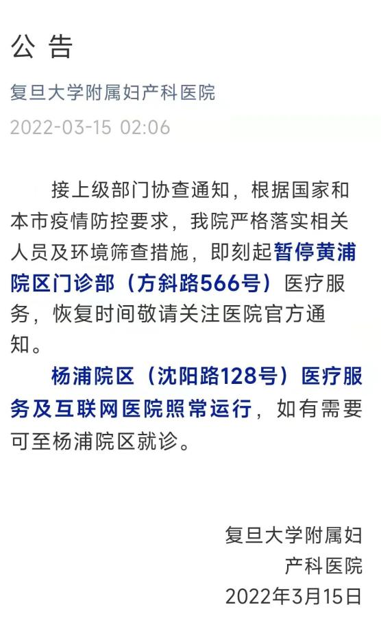 今天(15日)凌晨,复旦大学附属妇产科医院发布公告:黄浦院区暂停门诊医疗服务。