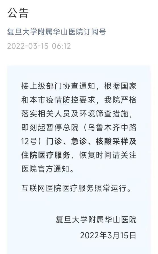 今天(15日)凌晨,复旦大学附属华山医院发布公告:总院暂停门急诊、住院等医疗服务。