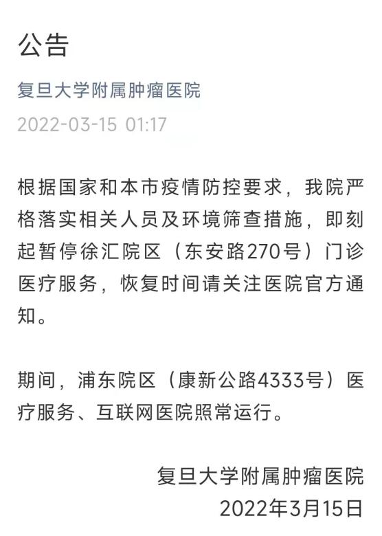 今天(15日)凌晨,复旦大学附属肿瘤医院发布公告:徐汇院区暂停门诊医疗服务。