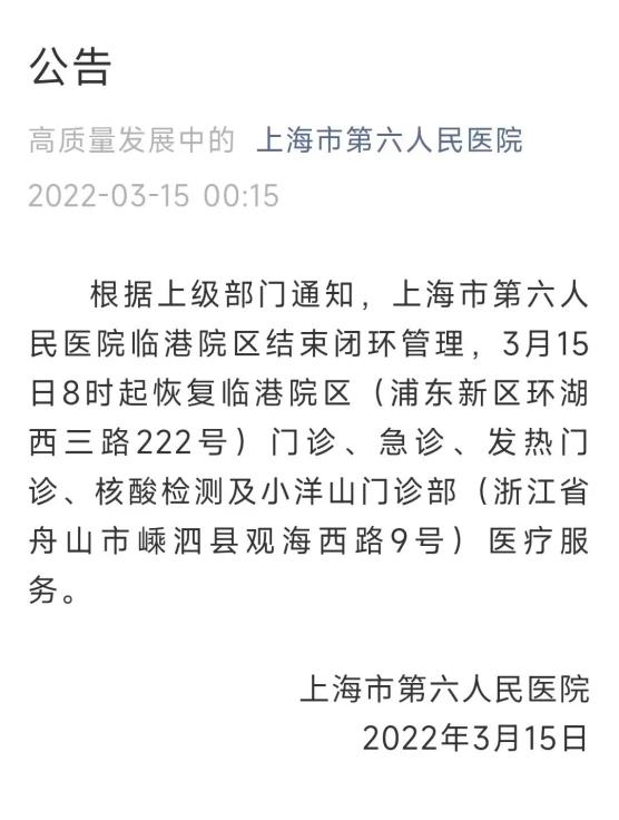 今天(15日)凌晨,上海市第六人民医院发布公告:临港院区恢复门急诊。