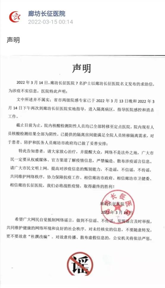 河北廊坊长征医院15日凌晨发布声明称,护士求助信为涉疫不实信息,文中所述不属实;省市两级院感专家已于3月13日晚和14日下午两次到该院实地指导,目前院内阳性人员均已转移至定点医院,院内现有人员核酸检测均为阴性,已提供的隔离房间能满足全院人员转移隔离需求。对患者、陪护和医务人员廊坊市政府均已做妥善安排。