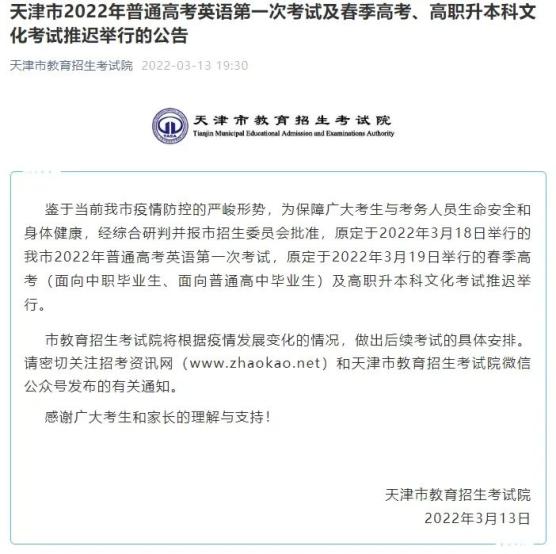 鉴于当前我市疫情防控的严峻形势,为保障广大考生与考务人员生命安全和身体健康,经综合研判并报市招生委员会批准,原定于2022年3月18日举行的我市2022年普通高考英语第一次考试,原定于2022年3月19日举行的春季高考(面向中职毕业生、面向普通高中毕业生)及高职升本科文化考试推迟举行。