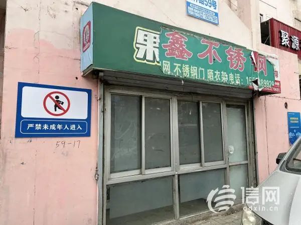 信网注意到,这家店店外采用磨砂玻璃门窗,进出口以门帘进行了遮挡,墙边悬挂了“严禁未成年人进入”的标识,从外观上虽然根本看不到内里的商品情况,但对于已经识字的小学生来说,这家店的神秘感以及门头的“情趣”二字,确实足以引起过往的学生好奇。