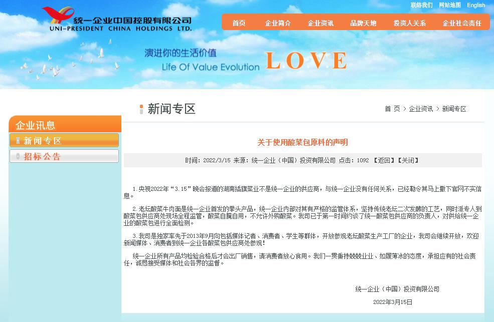 关于央视“3.15”晚会报道的湖南插旗公司与锦瑞公司生产的酸菜原料生产环境的问题,统一企业(中国)投资有限公司当晚在官网回应称,已于3·15当天在长沙市市场监督管理局的现场排查下,对采用的酸菜包原料及相关留档记录进行了彻底检查。经查询公司的交易记录,最近五年内,湖南插旗公司已不再是我司酸菜包原料的供应商,同时,公司已于第一时间约谈了湖南锦瑞公司的负责人,对相关的酸菜包产品已全部进行了封存,并在市场监管局的参与下一起进行质量检测。统一称,此次事件是管理的失误,对此表示深深的歉意。