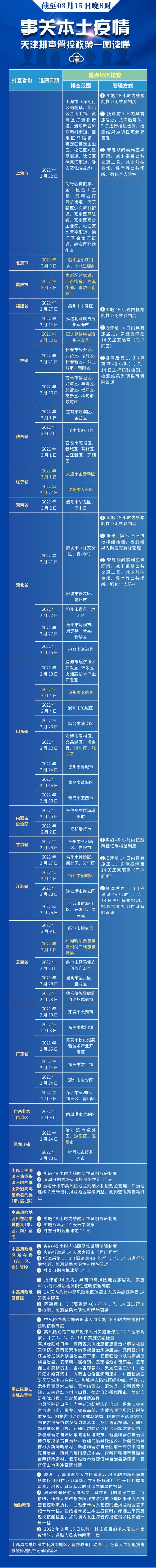 相关人员主动报备。新增具有2022年3月3日(含)以来途经北京市朝阳区小红门乡、十八里店乡、具有2022年3月5日(含)以来途经重庆市高新区曾家镇、西永街道、虎溪街道、香炉山街道、具有2022年2月22日(含)以来途经吉林省延边朝鲜族自治州汪清县、具有2022年3月1日(含)以来途经辽宁省大连市金普新区、具有2022年2月27日(含)以来途经辽宁省沈阳市大东区、具有2022年3月4日(含)以来途经山东省滨州市阳信县、具有2022年2月22日(含)以来途经山东省淄博市淄川区、张店区、具有2022年2月27日(含)以来途经江苏省常州市钟楼区、具有2022年3月4日(含)以来途经江苏省宿迁市宿城区、具有2022年3月1日(含)以来途经云南省红河哈尼彝族自治州河口瑶族自治县、具有2022年2月24日(含)以来途经黑龙江省哈尔滨市道里区、五常市旅居史的来津及返津人员,需持48小时内核酸阴性证明或出示包含核酸检测阴性信息的健康码“绿码”,主动向社区、工作单位等报备,抵津前14日内具有旅居史,实施抵津后14天居家隔离(同户同室)。
